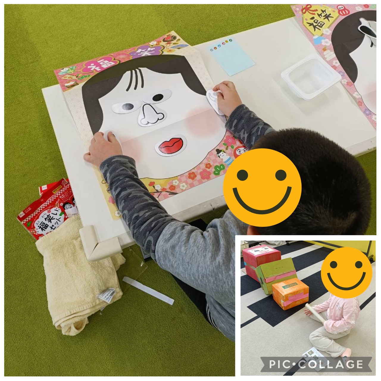 ゲームは凧あげやコマ、福笑い、だるま落としをして遊びました。