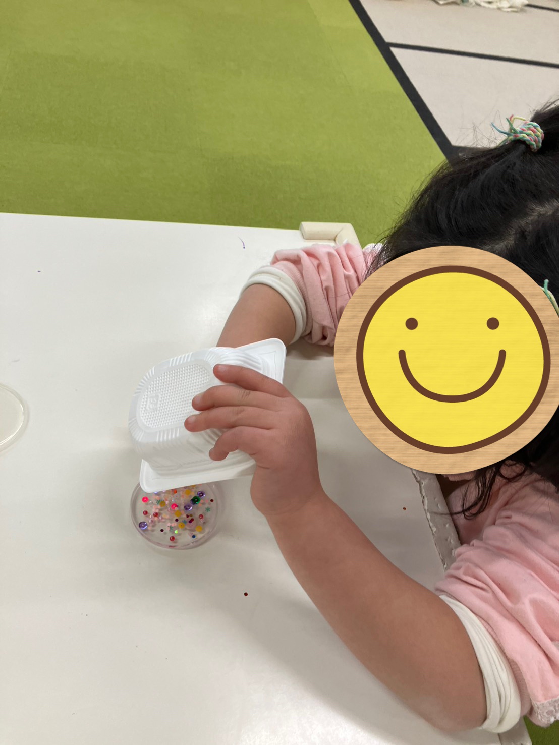 蓋に洗濯のりが出ないように気をつけながら入れています。次にスパンコールやビーズをいれて完成です。のりが乾いた時にお持ち帰りです。