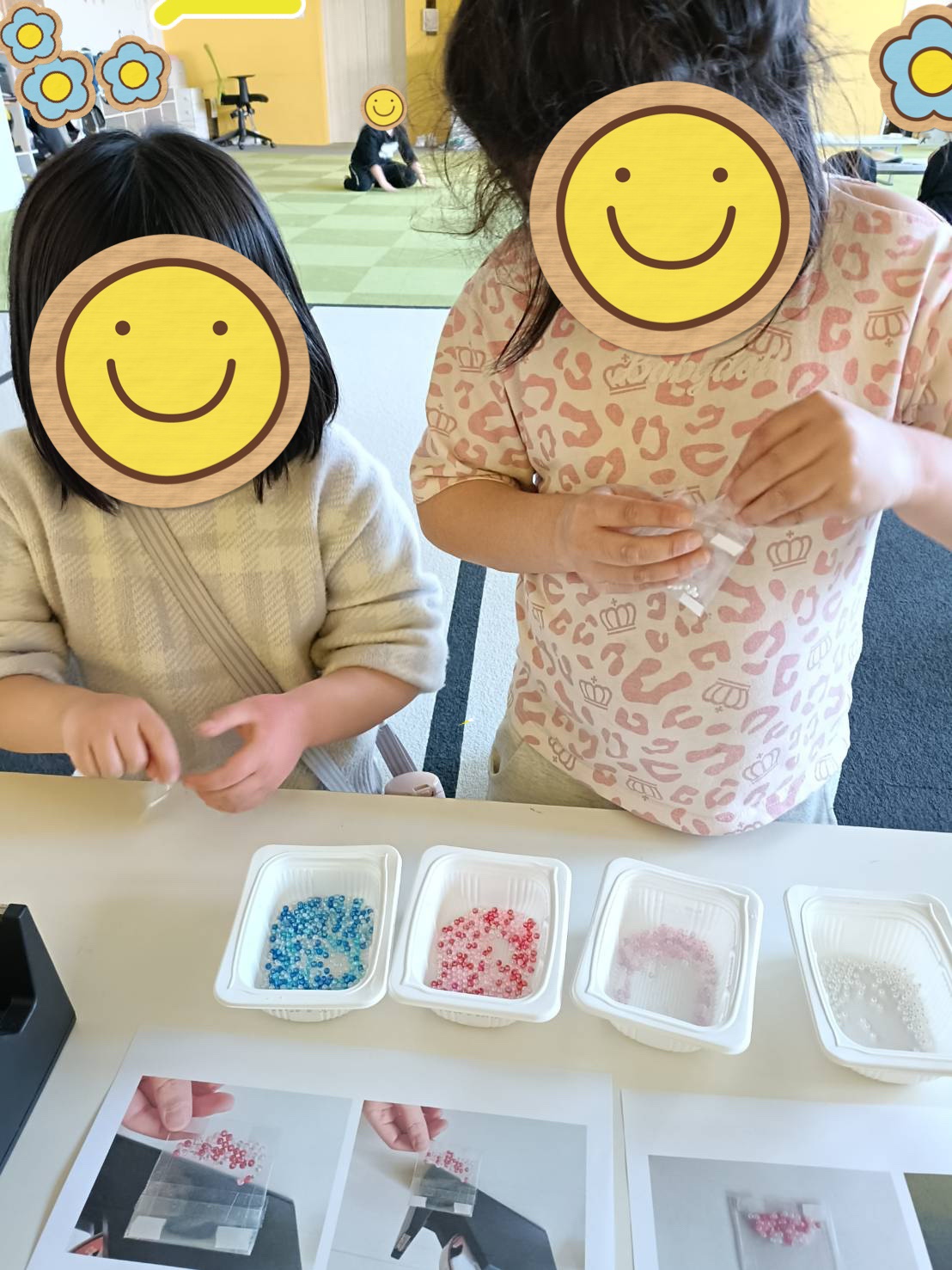 説明を聞いてビーズを袋に入れます。見本の写真と見比べて「同じくらいかな?」と確認していました。袋にセロハンテープをしてハート型の画用紙に両面テープを剥して貼り、ストローをくっつけて画用紙を上から被せました。